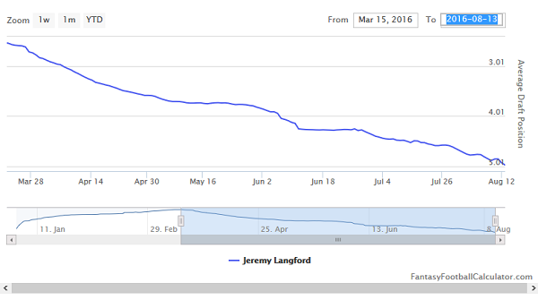 Even though the team may go with the "hot hand" on a game-by-game basis, Langford is the favorite to lead the team in touches on a weekly basis. And with his ADP dropping mid-2nd round in mid-March to early-5th now (see ADP chart below), he's not a bad value near the end of the seventh round in this mock draft.
